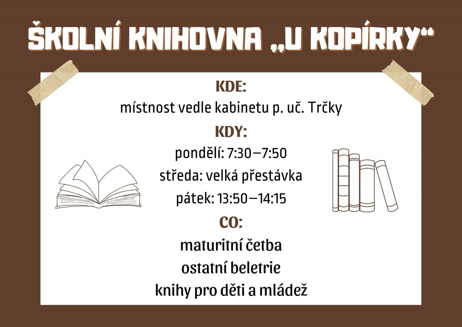 se u kopírky, vedle kabinetu pana učitele Trčky. Otevřena bude každé pondělí od